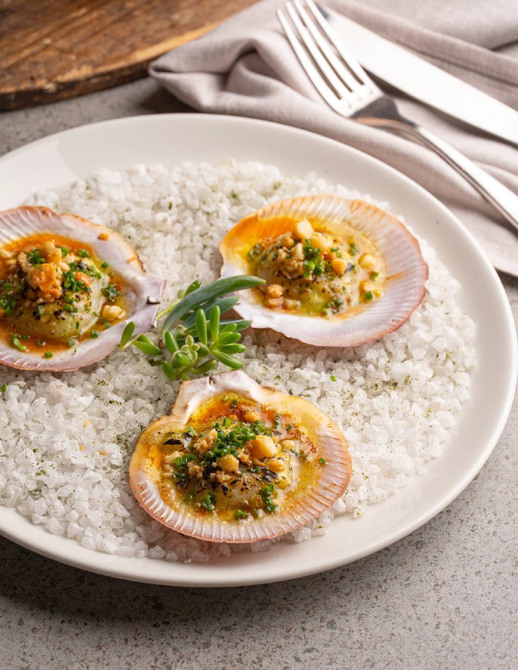 Baked Queensland Scallops with Macadamia, Bergamot & Herb Crust and Chilli